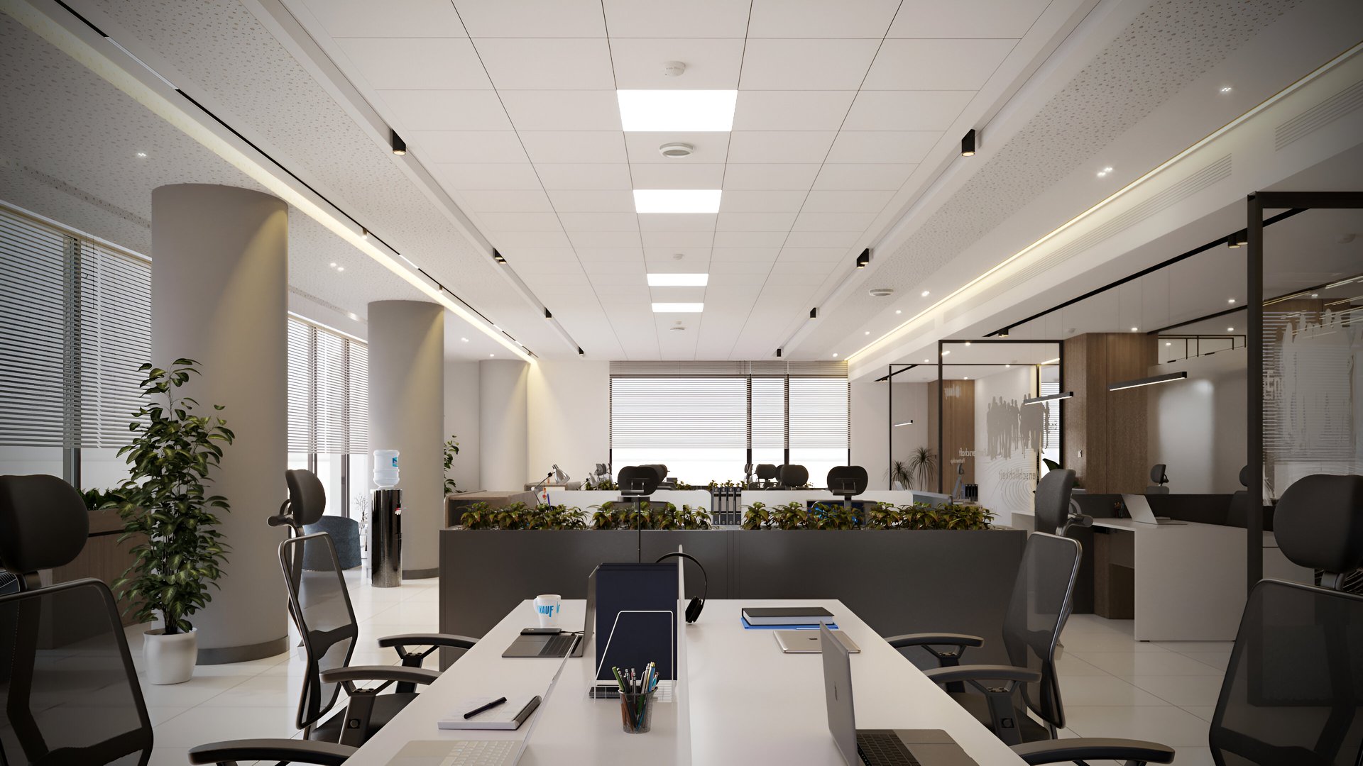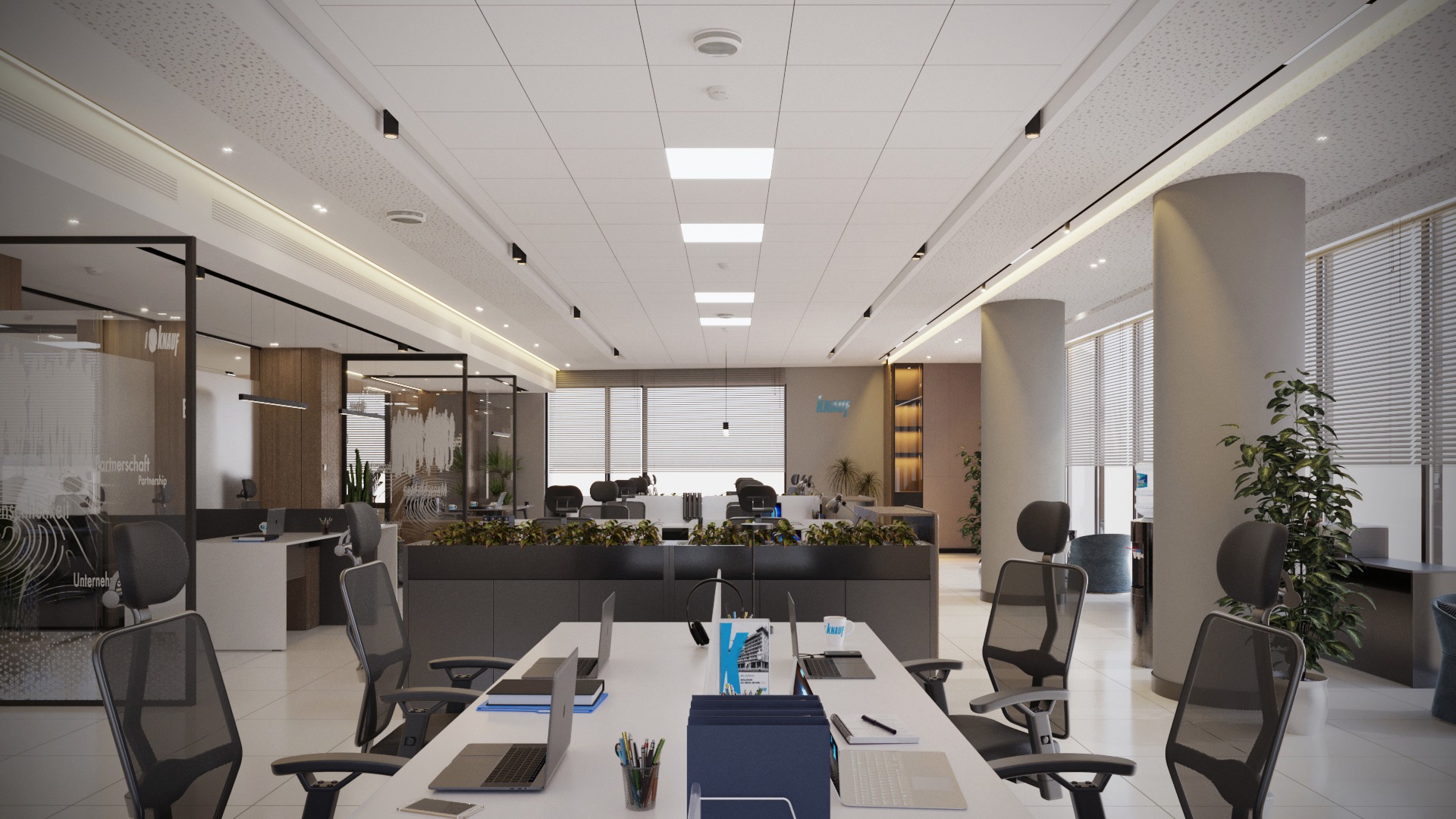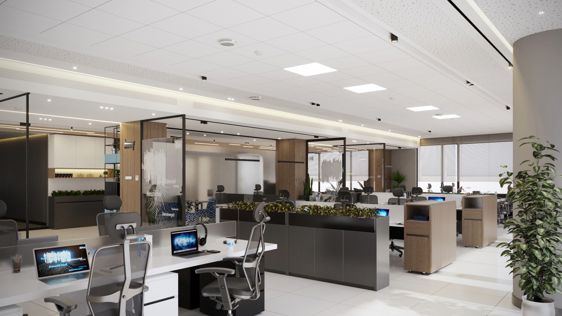 Le concept traduisent l'engagement en faveur d’un environnement professionnel de qualité, alliant esthétique contemporaine, fonctionnalité et bien-être. L’organisation de l’espace s’articule autour de postes de travail spacieux, d’allées dégagées et de séparations végétalisées qui apportent une touche de fraîcheur naturelle. Les grandes baies vitrées équipées de stores orientables permettent un contrôle optimal de la lumière tout au long de la journée.