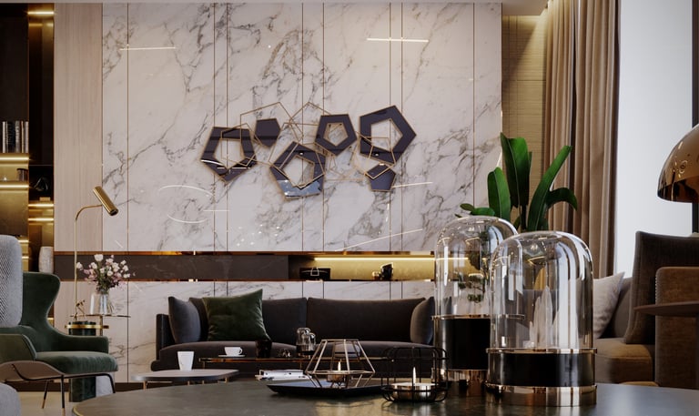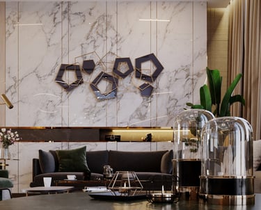 صالون راقٍ يتوسطه رخام مُعَرَّق فاخر يشكّل قطعة أساسية في الديكور الجداري، وتزيّنه تركيبة هندسية معدنية بتصميم فني معاصر. يجمع المكان بين الخامات الطبيعية واللمسات الفاخرة، مع أثاث عصري بخطوط انسيابية ومقاعد مريحة من المخمل الأخضر الداكن والرمادي الأنيق.