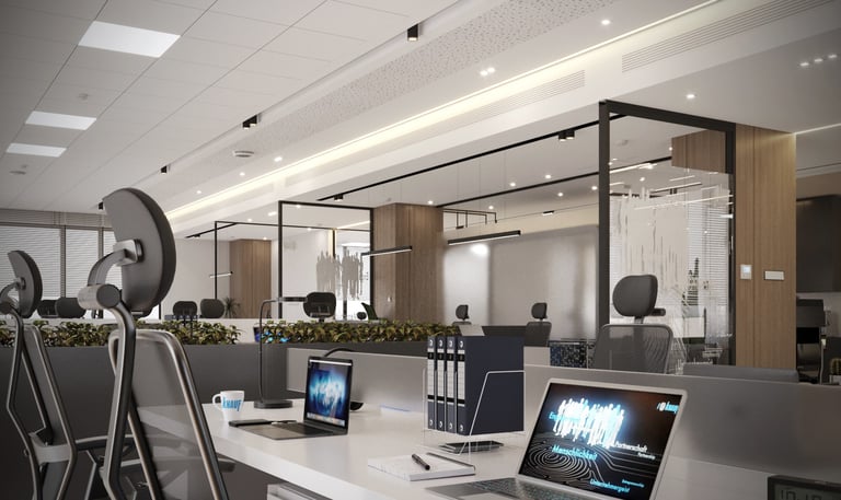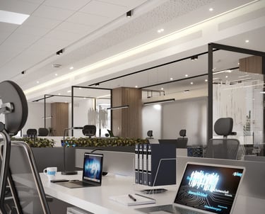 Un open space contemporain conçu pour offrir à la fois confort et productivité. L’aménagement privilégie la luminosité naturelle grâce aux larges baies vitrées et à un agencement fluide. Les séparations vitrées au design épuré, associées aux finitions en bois, apportent chaleur et élégance à l’espace de travail.